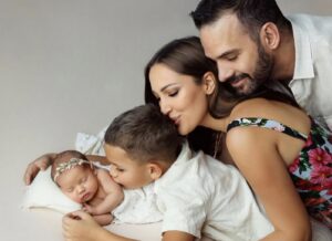 Na fotografiji je z možem Filipom Živojinovićem in sinom Aleksandrom, kako ljubeče objemajo trimesečno Ario.