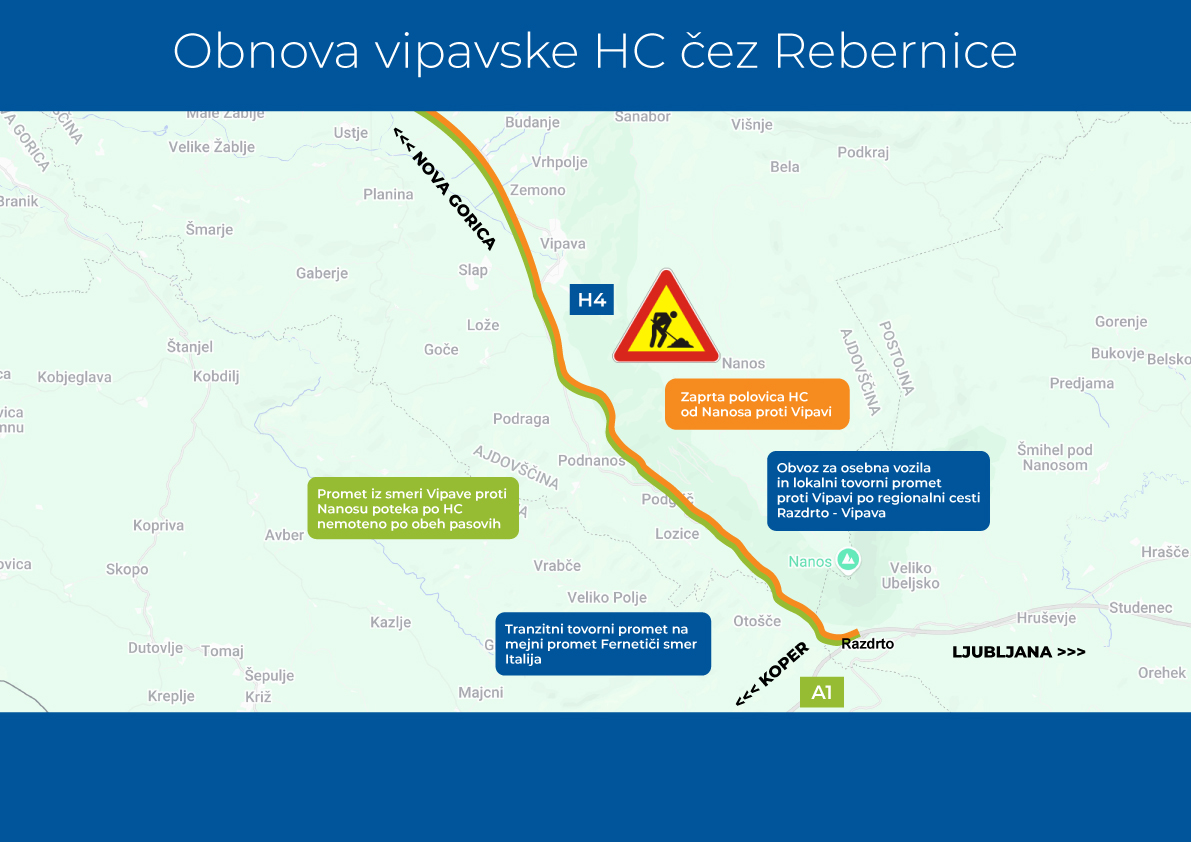 [ZAČETEK NOVE FAZE OBNOVE HITRE CESTE H4 – POPOLNA ZAPORA PROTI NOVI GORICI] 🚧 Na današnjem medijskem srečanju smo v družbi DARS predstavili nadaljevanje obsežnega projekta obnove hitre ceste H4 med razcepom Nanos in Vipavo. Dela na hitri vipavski cesti prek Rebernic bodo sredi… pic.twitter.com/rn1fiXomXZ