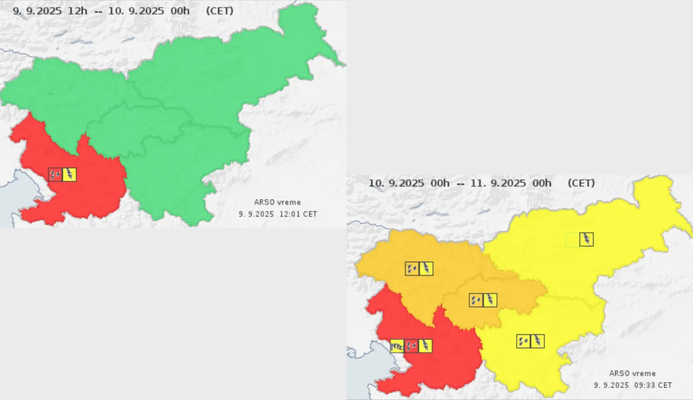 Agencija za okolje RS (ARSO) je za 9. in 10. september 2025 izdala rdeče vremensko opozorilo zaradi pričakovanih močnih in dolgotrajnih nalivov, ki bodo prizadeli predvsem zahodno, osrednjo in južno Slovenijo. Poplavljanje je najbolj verjetno na Primorskem, zlasti v slovenski Istri in na Vipavskem, kjer bo v kratkem času padlo veliko dežja.